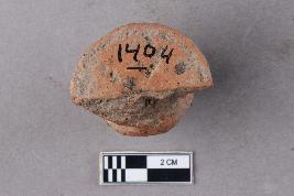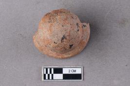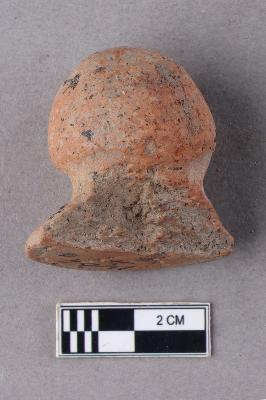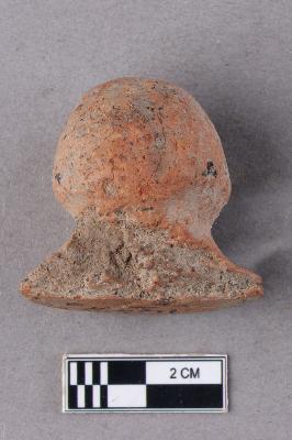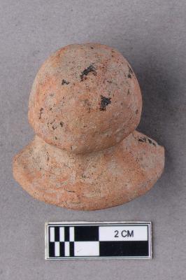 | Description / विवरण | A solid terracotta gamesman with a globular end that splays out into a flat circular end. It is red in colour. |