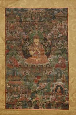 | Description / विवरण | Characterised of a two tier floral mount, the painting is dominated by three icons. Tsongkhapa 1347-1419 . He is portrayed in the teaching gesture and carrying his symbols, books and sword, on lotus flowers. |