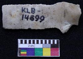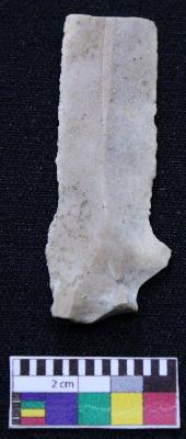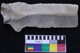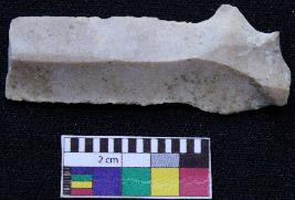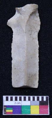 | Description / विवरण | Fragment of blade is off white in color, having positive bulb of percussion at one end, other end is broken, retouched parallel sides, mid ridge on the top and triangular section. |