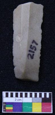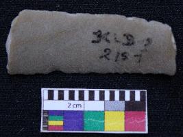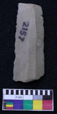 | Description / विवरण | Fragment of blade is dull brown in color, having one end is broken, retouched sides, ridges on the top and triangular section. |