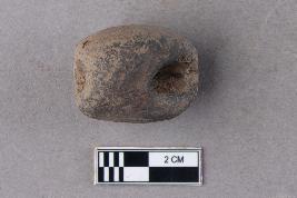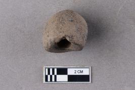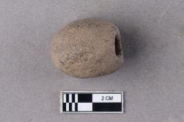 | Description / विवरण | A barrel-shaped terracotta bead that appears to be handmade with a central perforation. The perforations are very close to each other on one side of the bead giving it an irregular shape. It is grey in colour. |