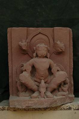 | Description / विवरण | Two armed seated statue of lord Surya . Both his hand are half broken. He puts on shoes and in udichyavesa. A seated worshipper is present on either side, circular halo is depicted behind the head on either side of which some carved but damaged projections can be seen. |