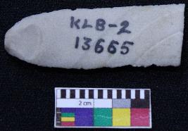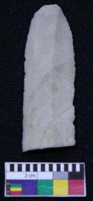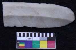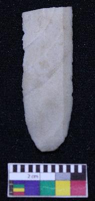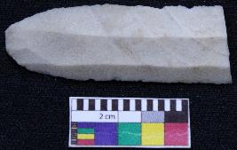 | Description / विवरण | Fragment of blade is off white in color, having one end broken, retouched sides, ridges on the top and thin section. |