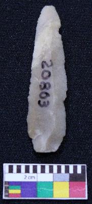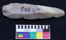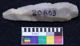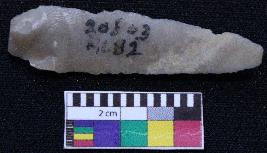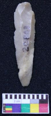 | Description / विवरण | Blade is dull brown in color, having smooth body, positive bulb of percussion at one end, other end is pointed, retouched sides and ridges on the top. |