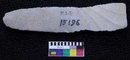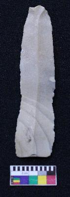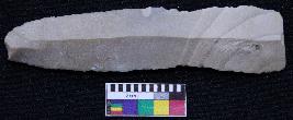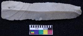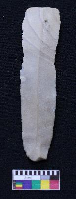 | Description / विवरण | Fragment of blade is off white in color, having positive bulb at one end, other end is broken, retouched sides, mid ridge on the top and triangular section. |