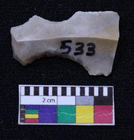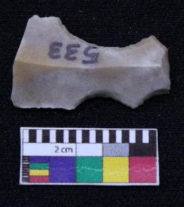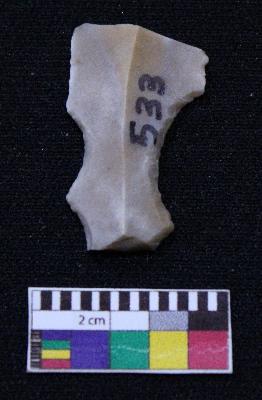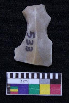 | Description / विवरण | Fragment of blade is having broken ends, retouched sides, mid ridge on the top and triangular section. |