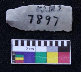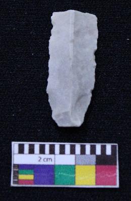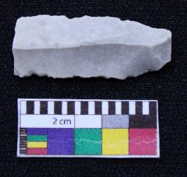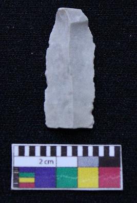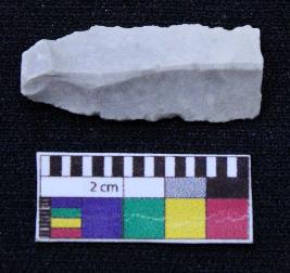 | Description / विवरण | Fragment of blade is white in color, having positive bulb at one end, other end is broken, retouched parallel sides, mid ridge on the top and triangular section. |