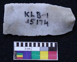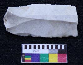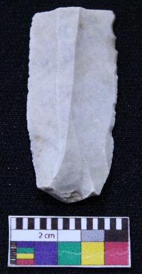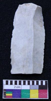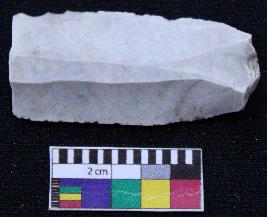 | Description / विवरण | Fragment of blade is white in color, having positive bulb at one end, other end is broken, retouched parallel sides, ridges on the top and triangular section. |