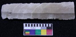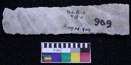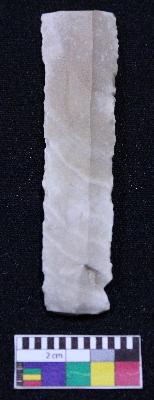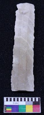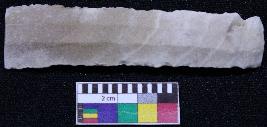 | Description / विवरण | Fragment of blade is off white in color, having one end broken, retouched parallel sides, ridges on the top and bands on it. |