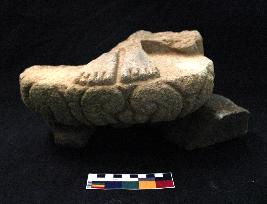 | Description / विवरण | The fragmented part has a feet on a lotus pedestal belonging to an unknown figurine. The image is standing in a Sampadasthanaka posture. The pedestal is a semi-circular one and has creeper-like marks carved on the edge. There is a broken part behind the feet indicating the presence of a stele. The figurine was carved in a high relief. Underneath the pedestal, there is a protrusion making the image remain unstable. |