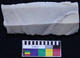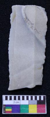 | Description / विवरण | Fragment of blade is off white in color, having both ends broken, retouched sides, ridges on the top and thin section. |