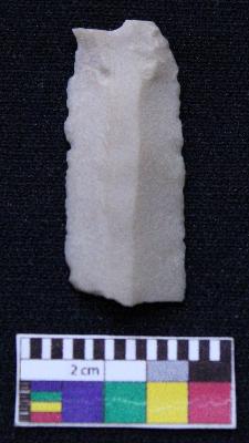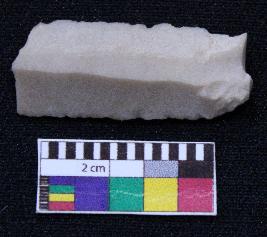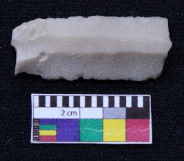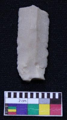 | Description / विवरण | Fragment of blade is brown in color, having smooth body, positive bulb of percussion at one end, other end is broken, retouched sides, ridges on the top and triangular section. |