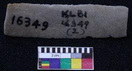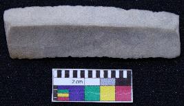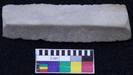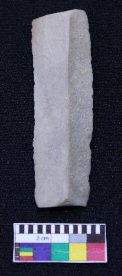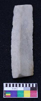 | Description / विवरण | Fragment of blade is off white in color, having smooth body, both ends broken, retouched parallel sides, mid ridge on the top and triangular section. |