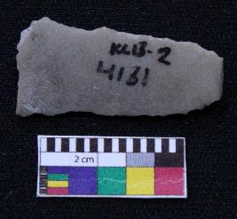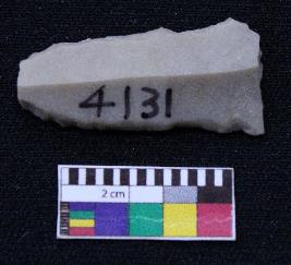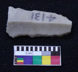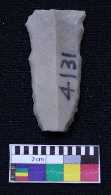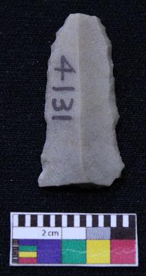 | Description / विवरण | Fragment of blade is off white in color, having one end broken, other end is curved, retouched sides, mid ridge on the top and triangular section. |
