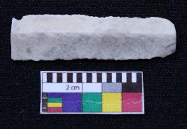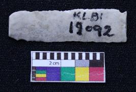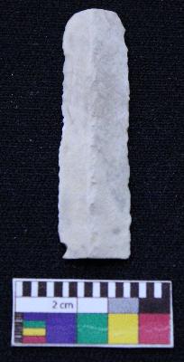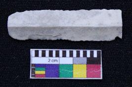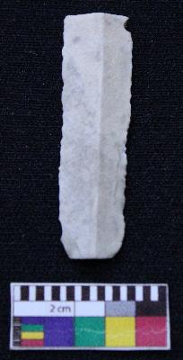 | Description / विवरण | Fragment of blade is white in color, having one end broken, retouched parallel sides, mid ridge on the top and triangular section. |