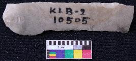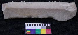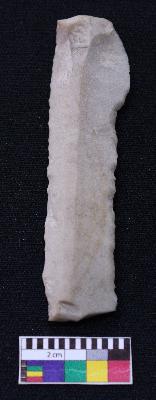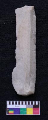 | Description / विवरण | Fragment of blade is off white in color, having positive bulb of percussion at one end, other end is broken, retouched sides, mid ridge on the top and triangular section. |