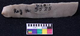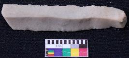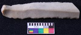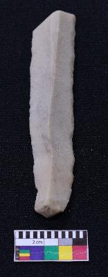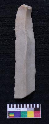 | Description / विवरण | Fragment of blade is off white in color, having positive bulb of percussion at one end, other end is broken, retouched sides, mid ridge on the top and triangular section. |