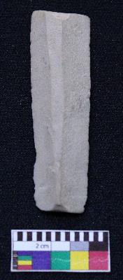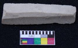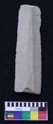 | Description / विवरण | Fragment of blade is off white in color, having smooth body, one end broken, retouched sides, mid ridge on the top and triangular section. |
