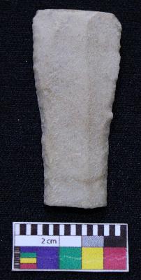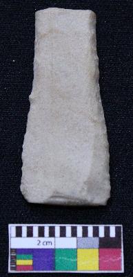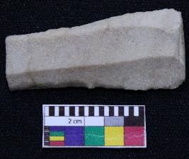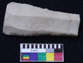 | Description / विवरण | Fragment of blade is off white in color, having one end broken, retouched sides and ridges on the top. |
