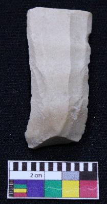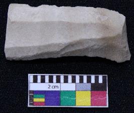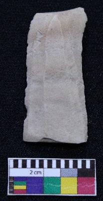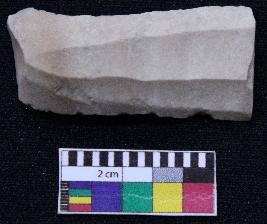 | Description / विवरण | Fragment of blade is off white in color, having one end broken, retouched sides and ridges on the top. |