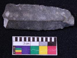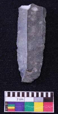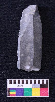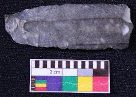 | Description / विवरण | Fragment of blade is black in color, having positive bulb of percussion at one end, other end is broken, retouched sides, mid ridge on the top and triangular section. |