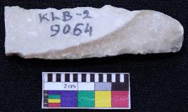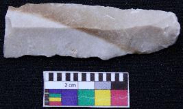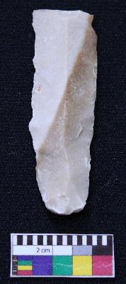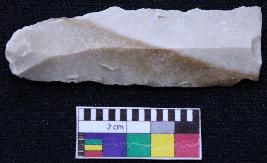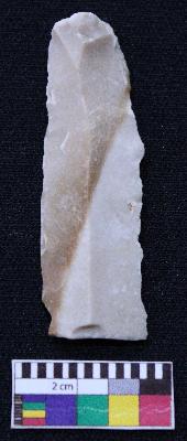 | Description / विवरण | Fragment of blade is partly brown and white in color, having positive bulb of percussion at one end, other end is broken, retouched sides, mid ridge on the top and triangular section. |
