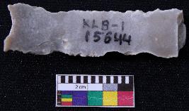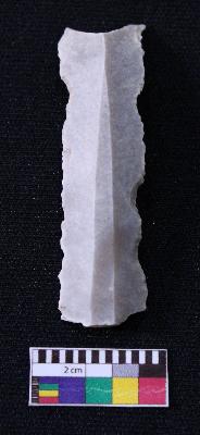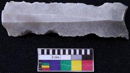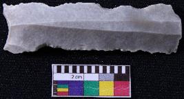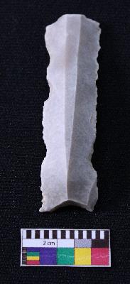 | Description / विवरण | Fragment of blade is off white in color, having one end broken, retouched sides, mid ridge on the top and triangular section. |