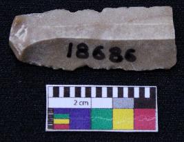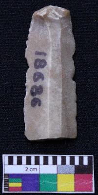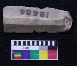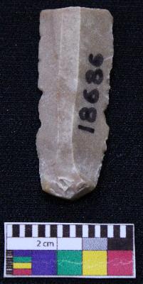 | Description / विवरण | Fragment of blade is brown in color, having positive bulb of percussion at one end, other end is broken, retouched sides, ridges on the top and triangular section. |
