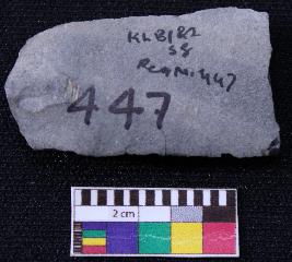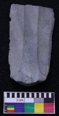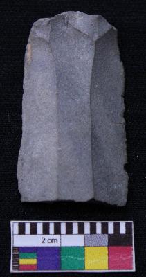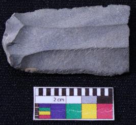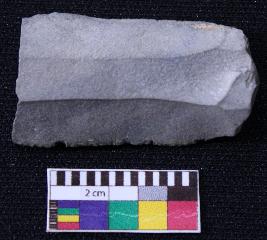 | Description / विवरण | Fragment of blade is black in color, having positive bulb of percussion at one end, other end is broken, retouched sides and ridges on the top. |