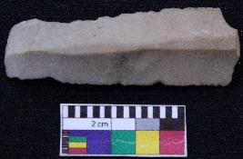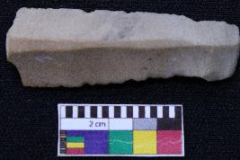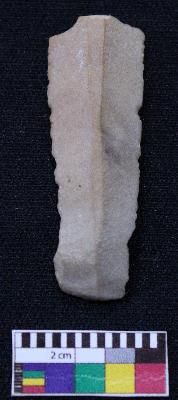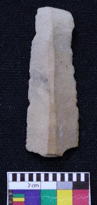 | Description / विवरण | Fragment of blade is dull brown in color, having one end broken, retouched sides, mid ridge on the top and triangular section. |