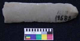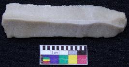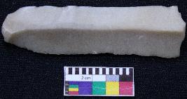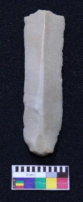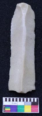 | Description / विवरण | Fragment of blade is off white in color, having positive bulb of percussion at one end, other end is broken, retouched sides, mid ridge on the top and triangular section. |
