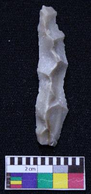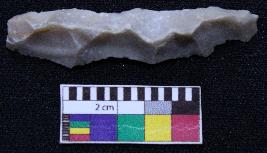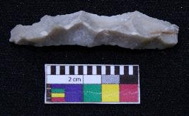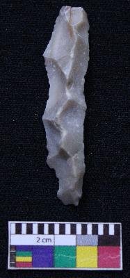 | Description / विवरण | Complete blade is dull brown in color, having smooth body, positive bulb of percussion at one end, other is pointed, retouched sides, mid ridge on the top and triangular section. |