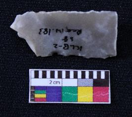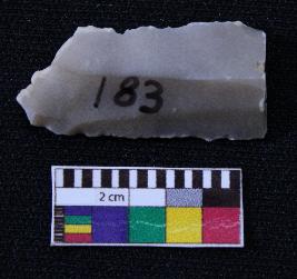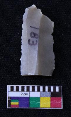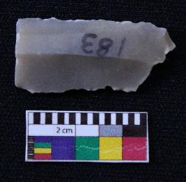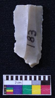 | Description / विवरण | Fragment of blade is having broken positive bulb of percussion at one end, other end is broken, retouched sides, mid ridge on the top and triangular section. |