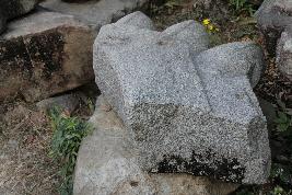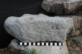 | Description / विवरण | This is a broken part of an architectural fragment. There are three elliptical protruding edges emerging from the main piece. Horizontal lines are visible over the architectural fragment. Three iron clamp sockets are visible over the architectural fragment. The rest of the portion is missing. |