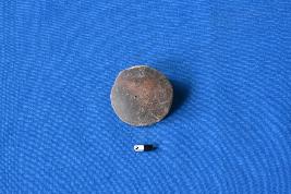 | Description / विवरण | A circular shaped hopscotch made on a potsherd of fine fabric, finished edges and a red slip on one side. The surface looks shady because of uneven firing. |