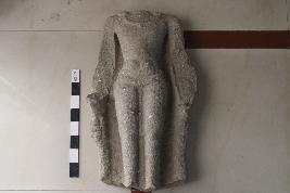 | Description / विवरण | This is a representation of a male figure standing in samapada-sthanaka posture under a decorative stele (with low relief carvings of floral patterns in it). The head portion including the neck is broken, both the arms are mutilated. The figure is beautifully decked up with haras hugging its neck. It is also adorned with a kayabandhi and an antariya. Its feet portion is sadly broken. The figure also has low relief carvings of two bulging round shaped pattern on its belly. |