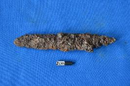 | Description / विवरण | A fragment of a knife of iron with a corroded surface and a tang at one end for hafting. |