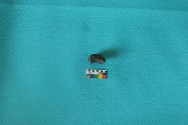 | Description / विवरण | A roughly cylindrical shaped bead of crystalline quartz slightly tapering on one side with a smooth surface and a perforation. |