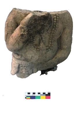 | Description / विवरण | This is a broken torso of an unknown figurine.The entire top and bottom part of the figure is mutilated and missing. Of the two hands, the right hand is upright toward the chest, while the left hand is down towards the hip. The figure is decorated with ornaments and the lower garment is beautified by some curving floral patterns. Other details are unclear |