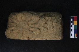 | Description / विवरण | It is a broken rectangular architectural fragment. The remaining segment has four faces and out of them, three fronts have decorative carvings in a bas relief. The motifs are of rhombus shaped. One has a full bloom flower and creepers hanging loose off of it carved on one side. The other two has rhombus shaped marks but devoid of any decorative markings. There is a metal clamp mark underneath the stone block. |