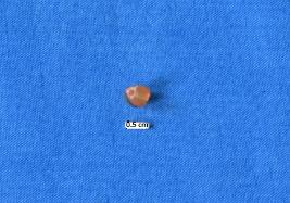 | Description / विवरण | Small carnelian bead in triangular cross section with perforation at the center. |