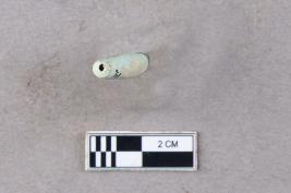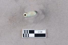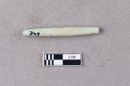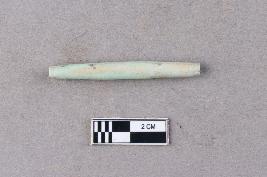 | Description / विवरण | A long, slender, bluish, barrel tube bead of faience. It is complete and the surface is relatively smooth. It appears to be a spacer bead. |