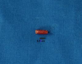 | Description / विवरण | A tubular shaped carnelian bead of reddish-brown colour with a pitted surface and perforation. |