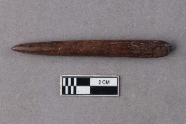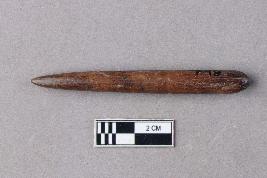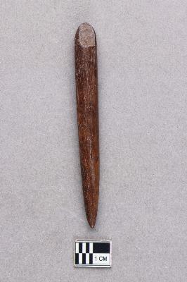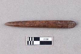 | Description / विवरण | A long, slender, cylindrical bone fragment that tapers into a sharp point. The surface is dark like that of aged or prepared bone and it is well polished. The other end is broken. |