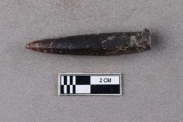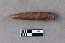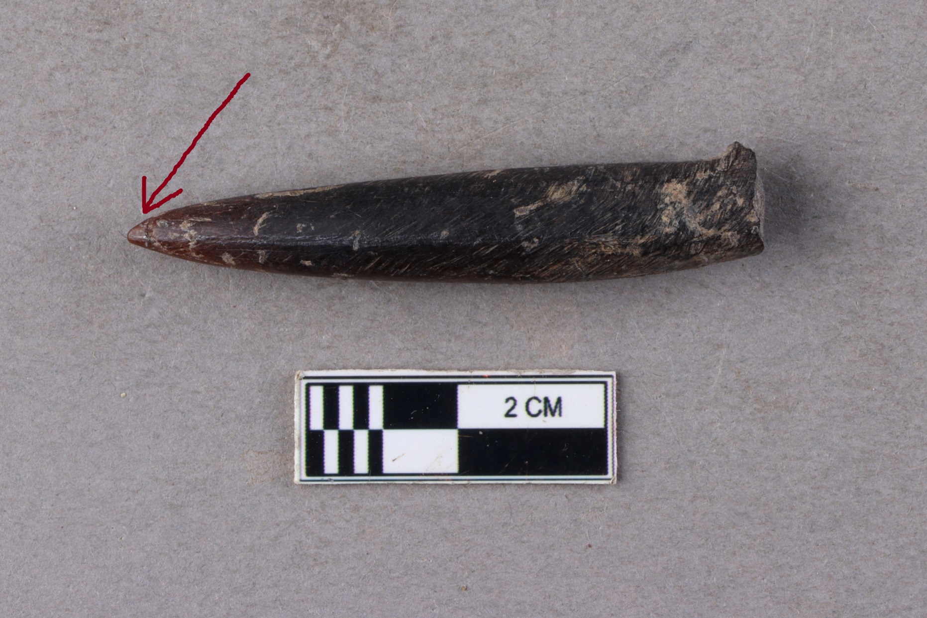 A long, slender, cylindrical bone fragment that tapers into a sharp point. The surface is dark like that of aged or prepared bone and it is well polished. The other end is broken. The facets on the surface show abrasion due to human modification.