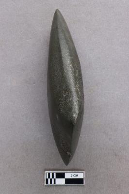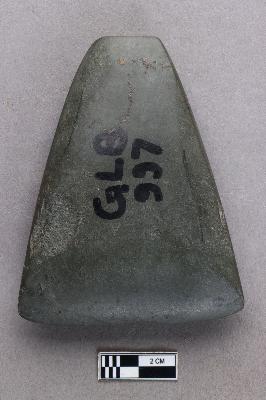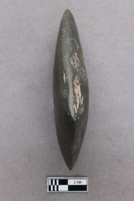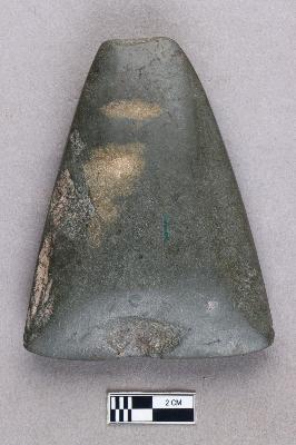 | Description / विवरण | A smooth, ground-polished trapezoidal celt of the axe variety with a few chips on the side. The butt end is narrow while the working end is broader and splayed. The surface is shiny due to the polishing. |