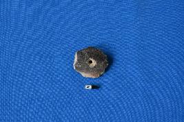 | Description / विवरण | A terracotta spindle whorl with unfinished corners and a hole in the middle. The fabric used is black slipped ware. |