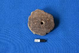 | Description / विवरण | A terracotta spindle whorl with unfinished edges and a hole in the middle. The fabric used is coarse red slipped ware. |