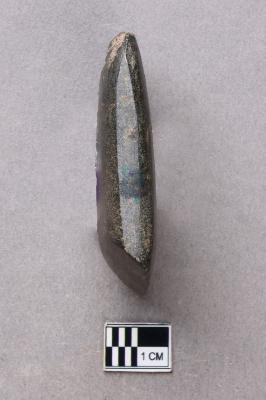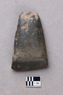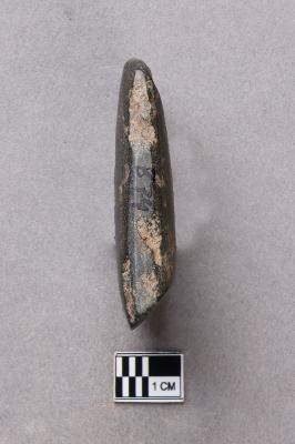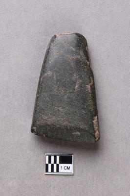 | Description / विवरण | A long, slender, trapezoidal ground polished stone adze of basalt with a smooth surface. There is some damage on the butt end and on one side. It is small in size and the working edge is lopsided in profile. |