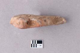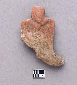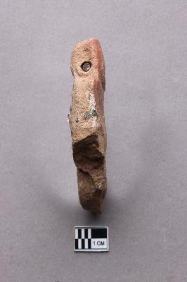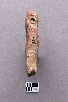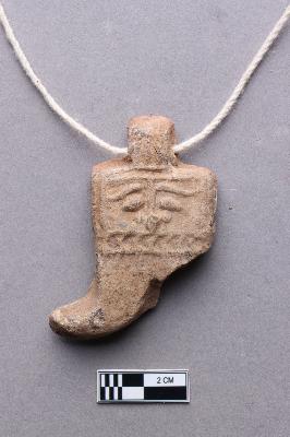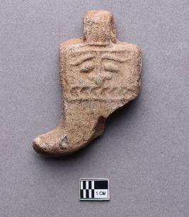 | Description / विवरण | An undressed terracotta pendant that has a squarish flat top and a curved bottom portion. The outlines of facial features such as almond-shaped eyes with thick eyebrows, a prominent long nose with flared nostrils and a chevron pattern probably representing the mouth or teeth can be seen on the square part of the pendant. The bottom part bifurcates into two curved boar-tusk-like appendages whose tips face the opposite direction, one such tusk is broken and missing. There is a slender tip on top of the pendant that acts as a loop for stringing. It appears to be handmade given the intricate details, however, the features were possibly stamped on the clay object before firing. |